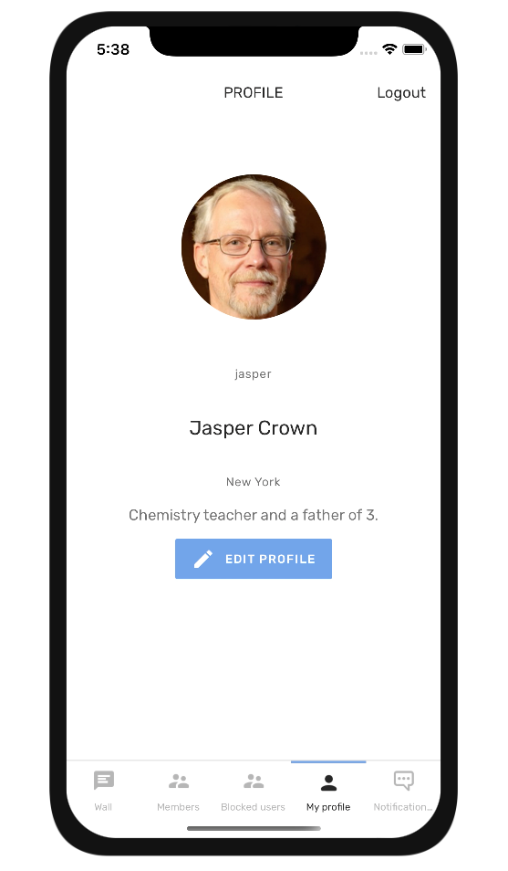 On My Profile screen users can see and edit their personal information, like their name and surname, location, website, and bio by clicking the Edit profile button. Users can also Log out from this screen, but it cannot be configured.