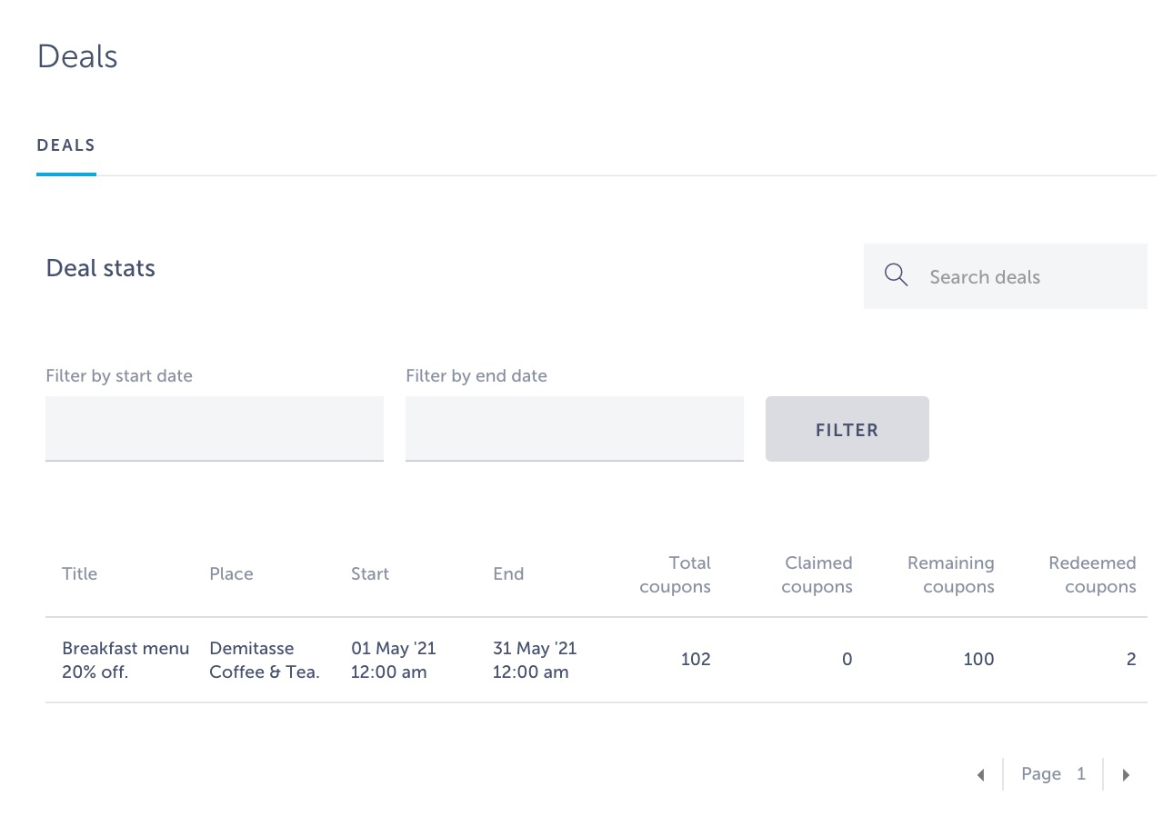 In Analytics tab, you can see the total number of coupons, how many coupons were claimed, the remaining number of coupons and redeemed coupons.