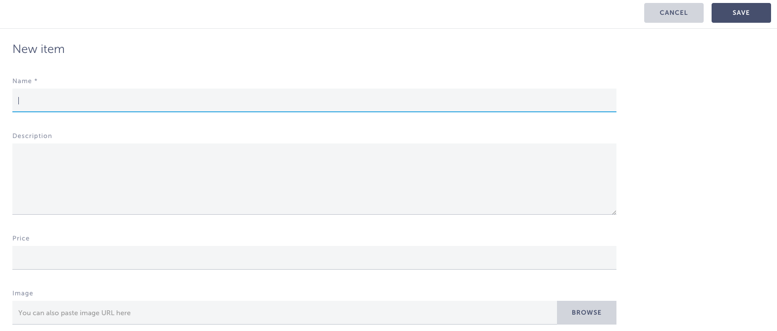 - Name – The name of your item as it appears on the menu (mandatory! note the asterisk *)