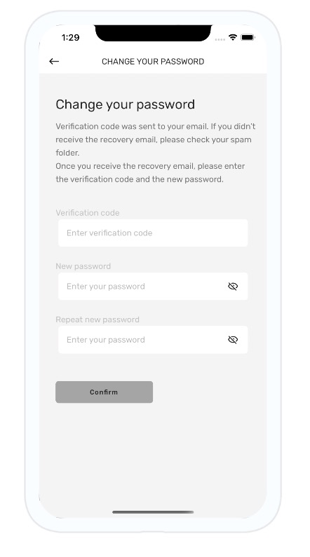 - Go back to the app and insert the verification code, along with a new password (password needs to consist of at least 6 characters)